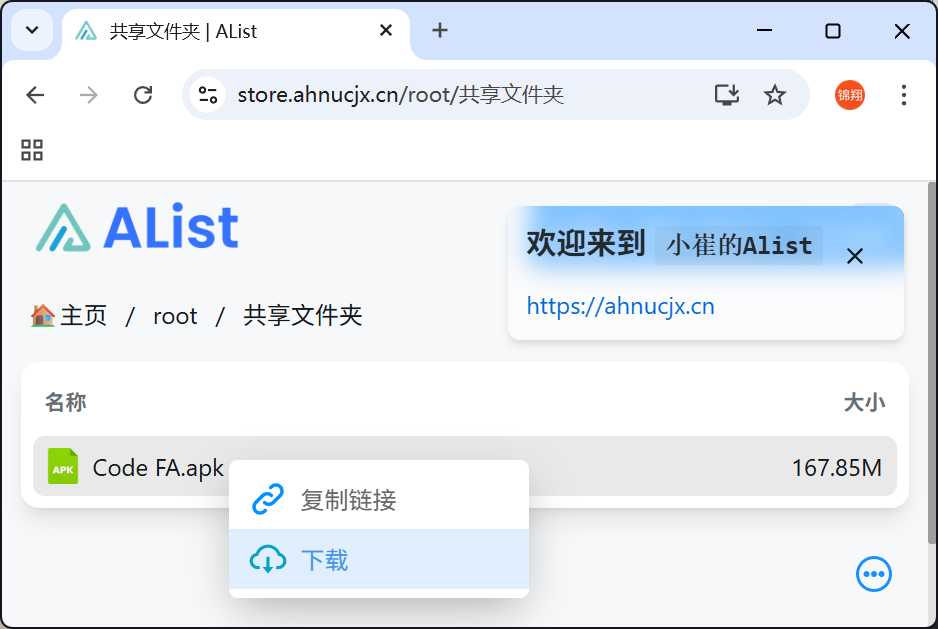 我已将Code FA的安装包存放在我的Alist服务器共享目录中,你可以通过浏览器直接访问下载: